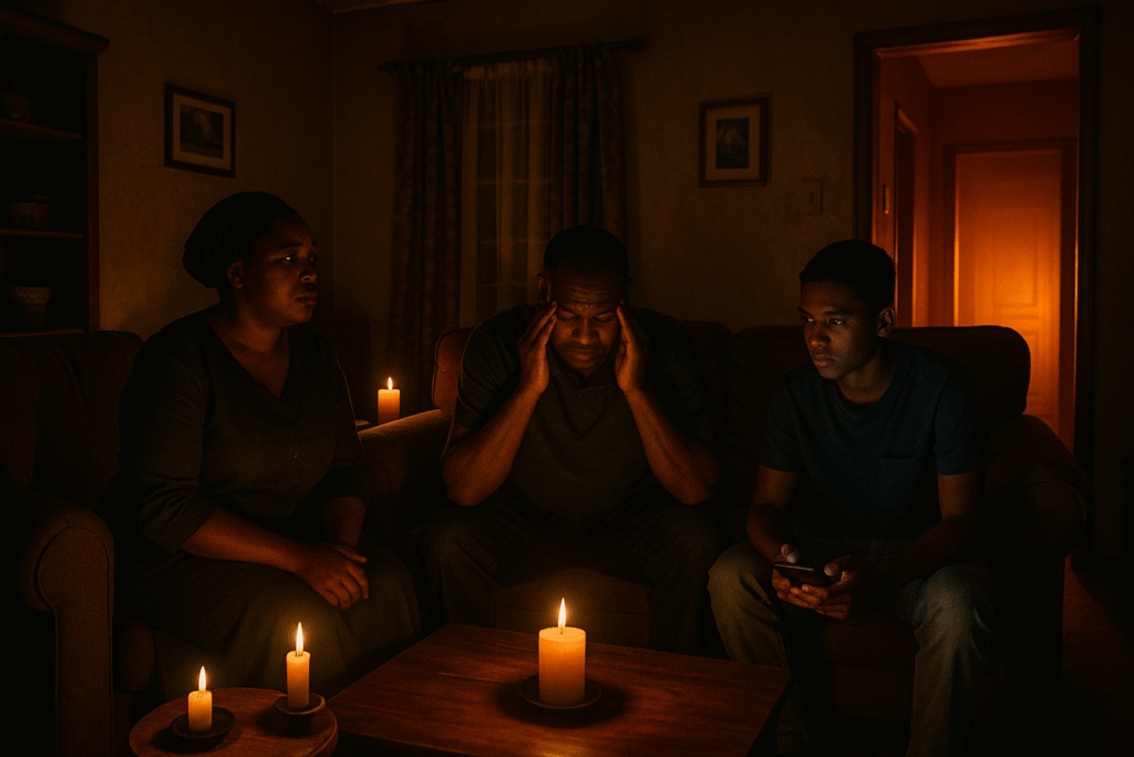 This is a 30 second to 1 minute ad concept written like a short film. It opens on a family sitting in the dark, candles flickering, power out. They’re tired, quiet, and annoyed. Then a strange orange glow shines from the hallway. It’s coming from Thuli’s room.