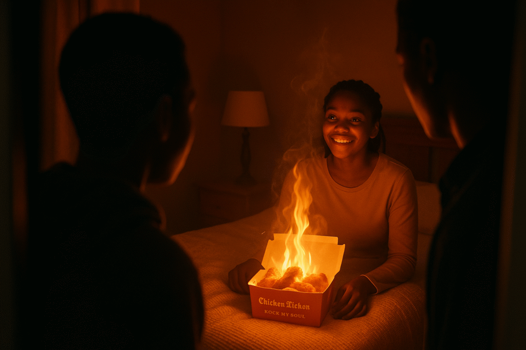 When her brother opens the door, he finds her Chicken Licken Rock My Soul meal glowing like actual fire. The whole family gathers, amazed.
